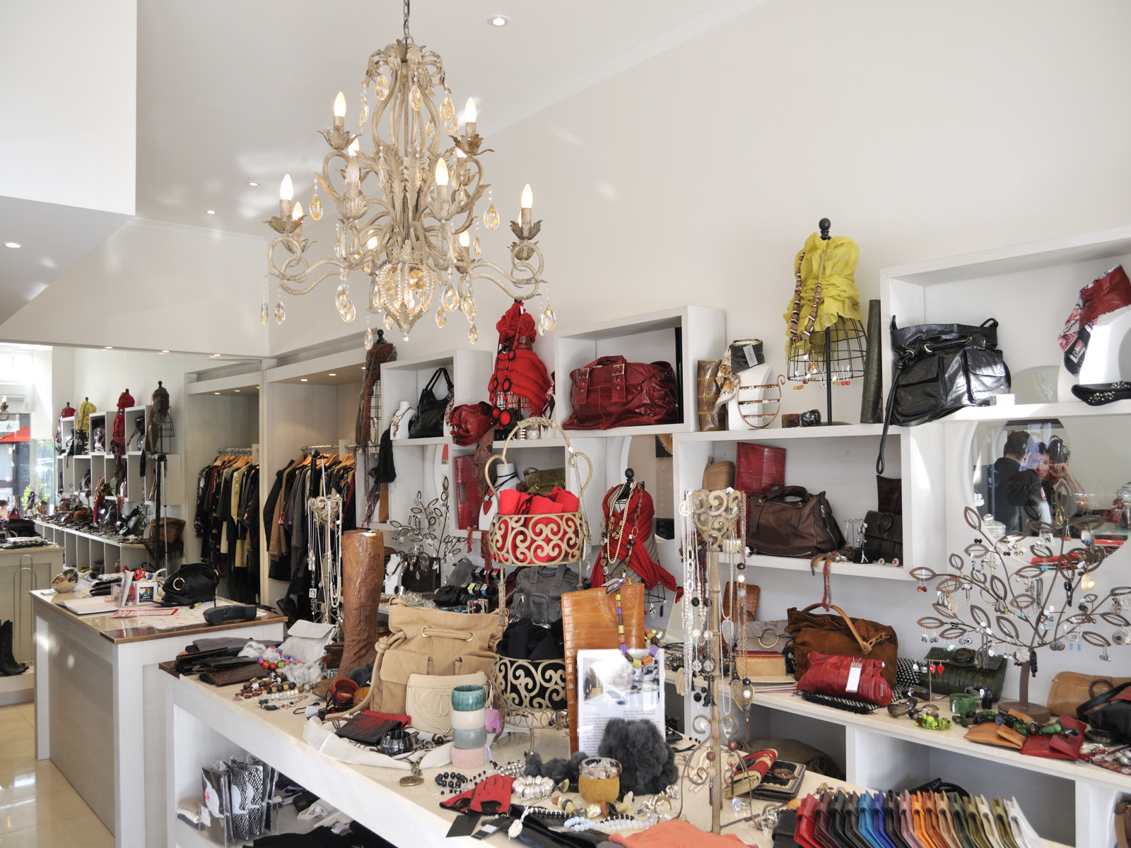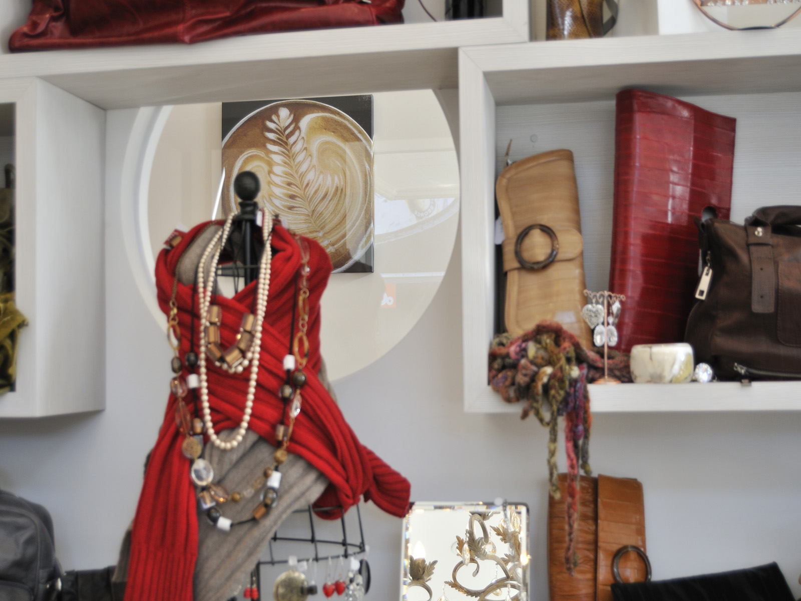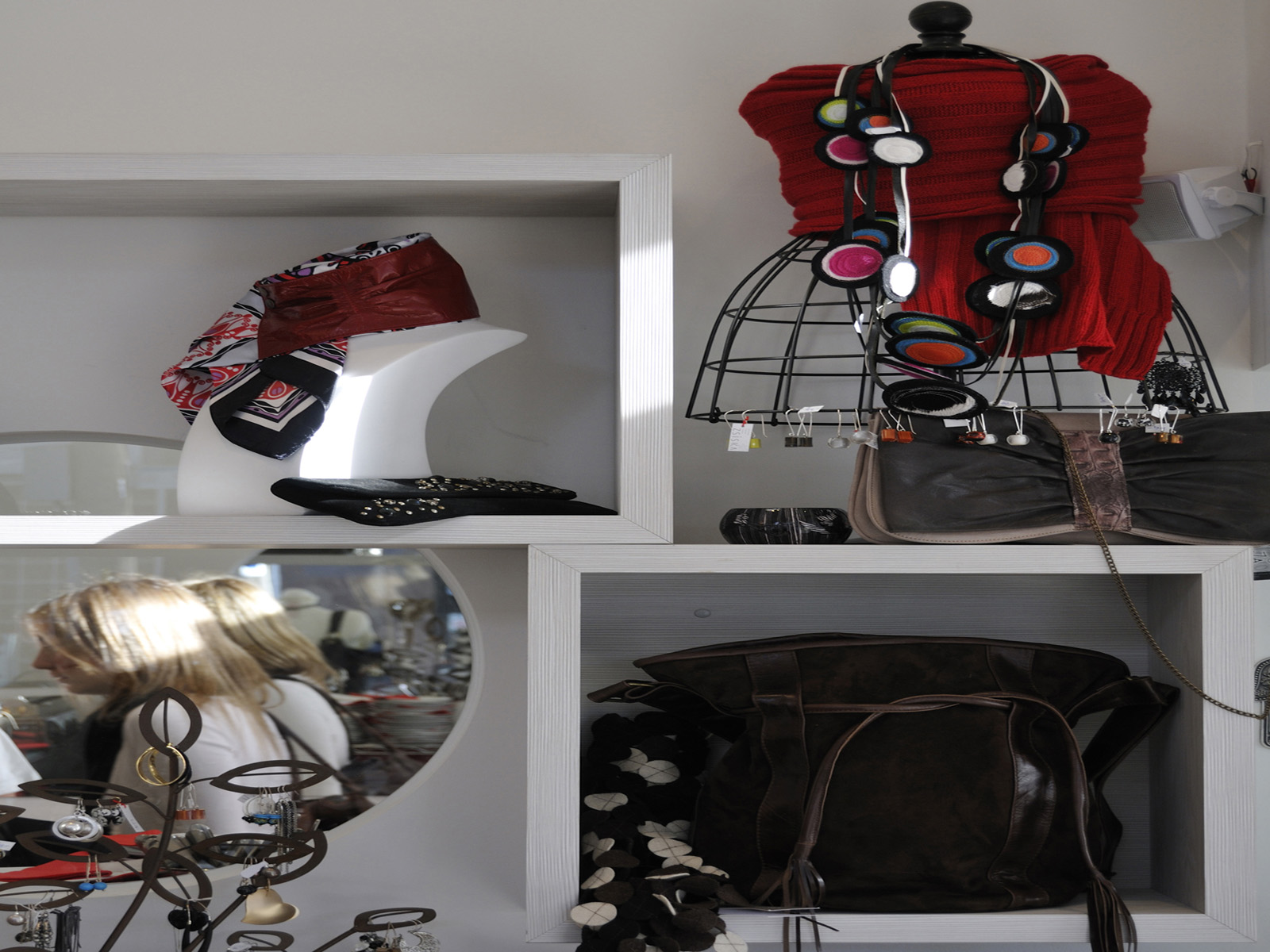 The series of frames allow for a sense of organisation in an otherwise chaotic space. The frames not only contain the products, they also highlight the relationship between the clothing store and the cafe, as do the round windows which provide interaction between the two spaces.